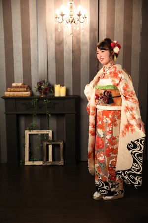 鮮やかなオレンジ紅葉、裾に流水柄。