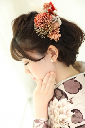 髪型は、ショートをまとめて髪飾りの色合いもマッチしてます。
